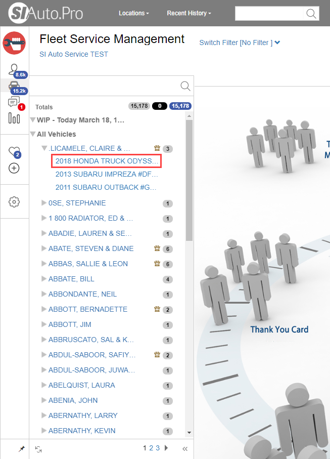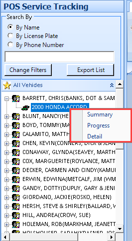 From the list of customers under POS Service Tracking, left click the name of the customer whose vehicle report you want to send an email of.